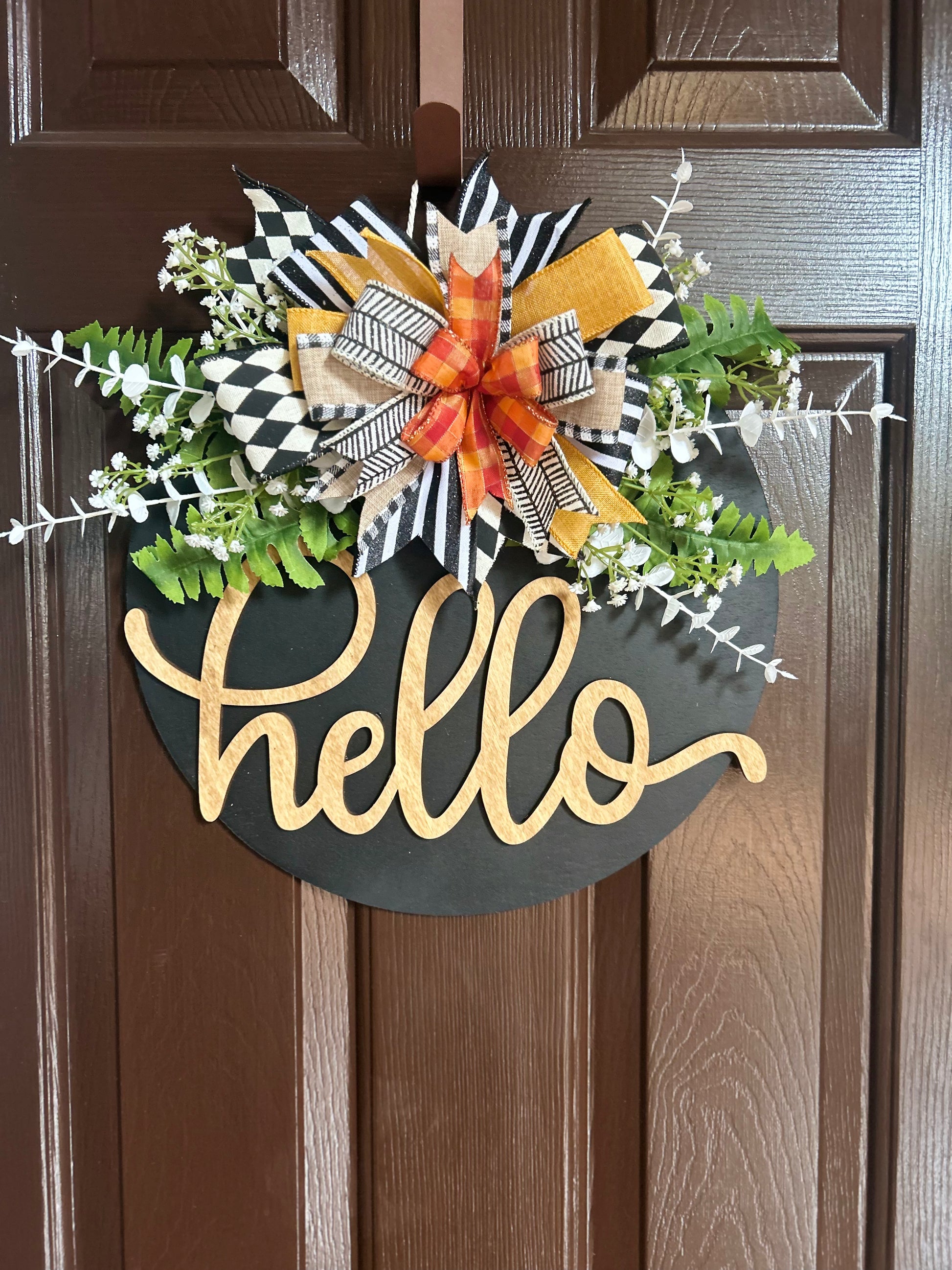 Your door deserves this! A chic black base, stained wood “hello,” and a bow bursting with patterned ribbons and greenery make this hanger a must-have for any season. Whether on your front door, porch, or even indoors as wall decor, it’s sure to make a stylish first impression.